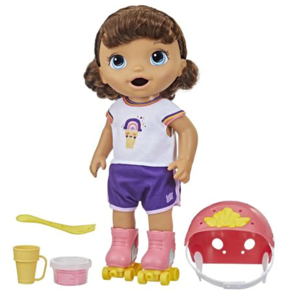 Baby Alive Roller Skate Baby is full of playtime fun with skating, snacks and super-cool style! Featuring real working doll roller skates, kids will have a blast zipping baby around. This Baby Alive doll for kids ages 3 and up includes adorable doll accessories, such as roller skates, helmet, spoon, plastic cone, and 1 can of solid doll food. Both parents and kids will love that this doll that eats and poops features a click-change diaper flap for easy diaper changes and repeatable play. This 12-inch baby doll with roller skates also features a colorful and stylish romper doll outfit. Roller Skate Baby doll is an awesome toy for girls and boys and she makes a great gift for birthdays and holidays. Baby Alive and all related properties are trademarks of Hasbro.