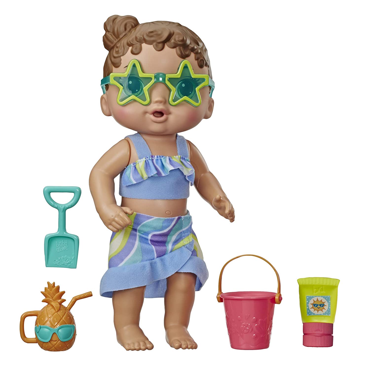 Get ready to imagine a fun day at the beach with the Baby Alive Sun 'n Sand Baby doll! This adorable brown-haired doll comes wearing a removable top and sarong that kids can pair with her sunglasses accessory to show off a stylish summer look. With the pail and shovel accessories, kids can imagine their baby doll is building sandcastles or playing in the sand with her beach toys. Little mommies and daddies can make sure baby is safe from the sun like a real baby with the toy sunscreen bottle accessory -- pretend to put it on so she doesn't get a sunburn! Kids can also pretend their baby doll is thirsty for a fun and fruity juice and imagine she is sipping from her tropical drink cup accessory. With this toy and her cute beach accessories, kids ages 3 years old and up can take care of their doll with everything she needs for a fun day in the sun! Baby Alive and all related properties are trademarks of Hasbro.