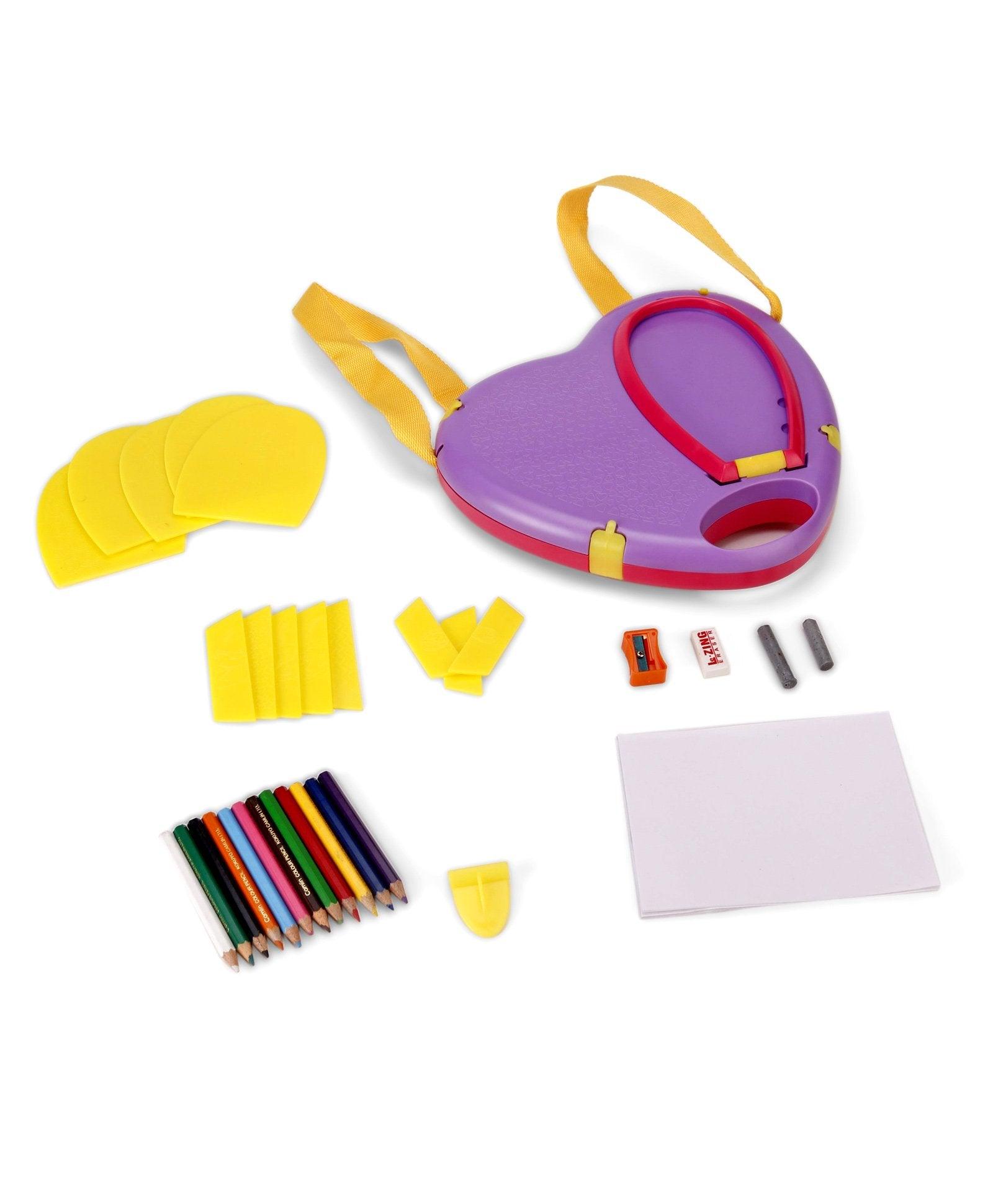 Product Includes - Heart Shaped Bottom Unit, Heart Shaped Top Unit, Crayon Holder, Head Design Tile, Torso Design Tile, Leg Design Tile, Middle Pattern Tile, Bottom Pattern Tile, Crayon Piece, Colour Pencil, Paper Sheet, Eraser, Sharpener, Instructions