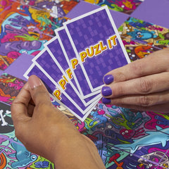 Is it a puzzle? Or is it a card game? It’s … both! The Puzl It game is the competitive puzzle card game for ages 7 and up! In this addictive, easy-to-play game, players take turns laying down cards from their hand to build a puzzle. The more cards they connect, the more cards they can steal from another player’s deck. But if a player gets a Blocker card, their deck is off limits! Be the last one with cards left to win! And as a bonus, the winner gets to complete the puzzle. With 72 thick, sturdy cards, the Puzl It family card game can be played over and over. It even comes with a handy reference poster to show players what the completed image should look like—a hilarious under-the-sea scene with lots of whimsical details to seek and find!