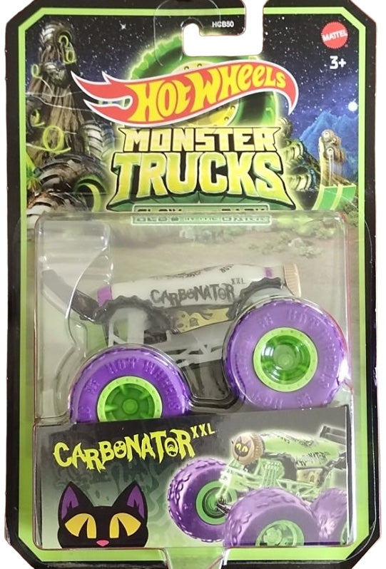 The action gets more exciting when the lights go off with Hot Wheels® Monster Trucks that glow in the dark! Glow-in-the-dark elements on each vehicle in the line bring a new edge to "light speed", while mega-sized wheels and awesome designs inspire endless crashing and smashing action -- watch them battle it out in the dark! Epic personalities add to the fun with details -- like name, truck type, strength and unique crash attack -- on the package. Monster trucks fans and collectors will want them all!