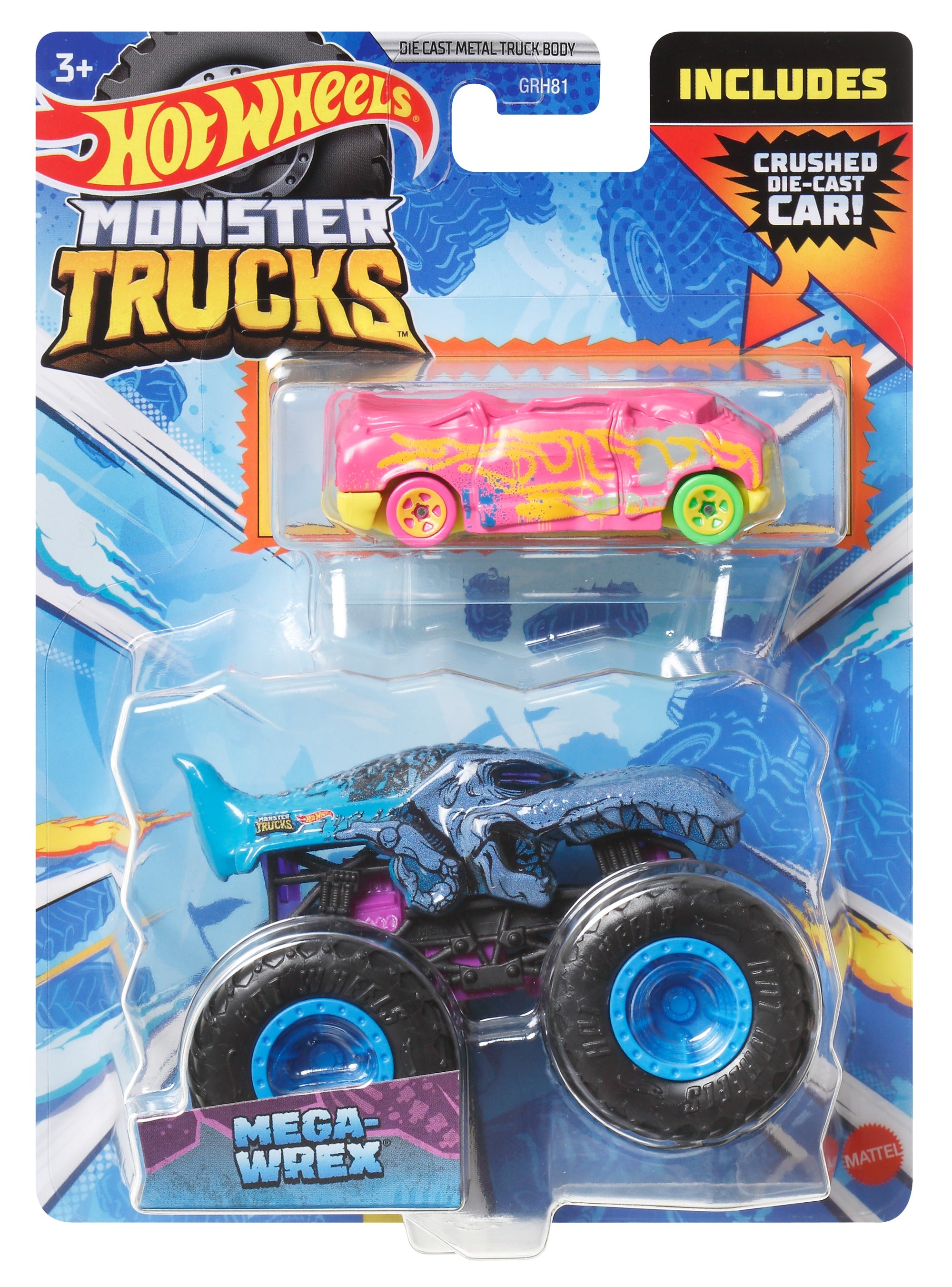 Hot Wheels® Monster Trucks 1:64 scale die-cast trucks are the baddest trucks ever built for competition and ultimate dominance! Each of these Hot Wheels® Monster Trucks also includes a Hot Wheels® die-cast car in matching deco so the two can face off for lots of crashing action. The two-vehicle package provides stats for each vehicle including the name, truck type, strength, unique crash attack and motor-vation for great storytelling fun. Kids can collect them to smash, crash and square off in head-to-head battles with their GIANT wheels! Each sold separately, subject to availability. Colors and decorations may vary.
