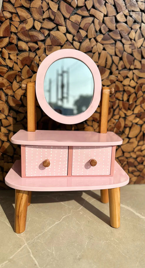 Make your mini-me’s year with this fantastic ultimate pink vanity set. Crafted from wood and painted in pretty shades of pink and white, this marvellous set comes with a wooden vanity mirror and accompanying playset. Perfect for budding make-up artists, the vanity is just the right height for little ones to sit in front of, with an adjustable round mirror, polka dot-decorated drawers,