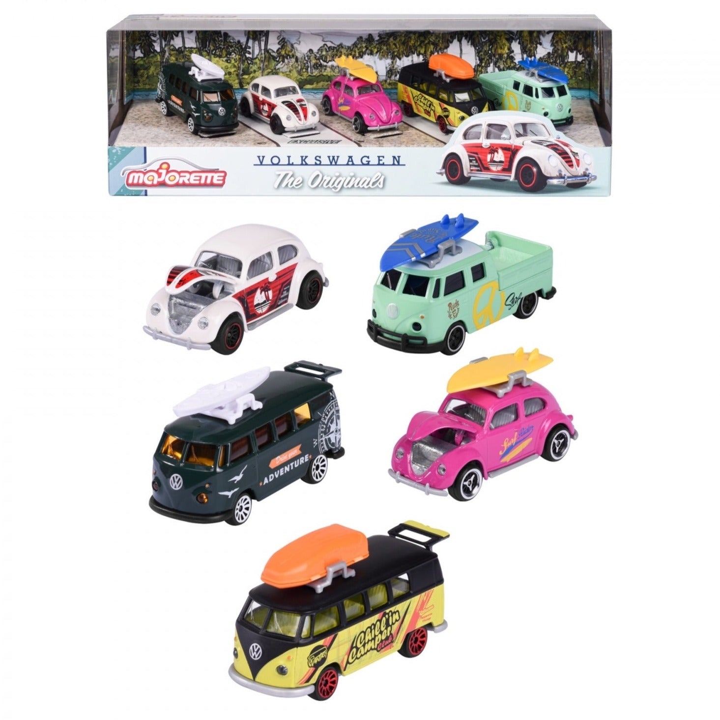 A must-have for Volkswagen fans: Five chic vehicles from Majorette in a 5-piece gift set These officially licensed vehicles from Majorette are the perfect gift for vehicle fans and collectors. The gift set includes 5 intricately designed model vehicles, two of which are only available in this set. In addition to the eye-catching looks, the vehicles also feature practical rotating wheels and opening parts, which are ideal for imaginative play. The set includes popular models such as the Volkswagen Beetle and Volkswagen T1 – all with colorful designs. Each vehicle has moving parts that can be opened and closed to stimulate your child’s curiosity and encourage imaginative play.