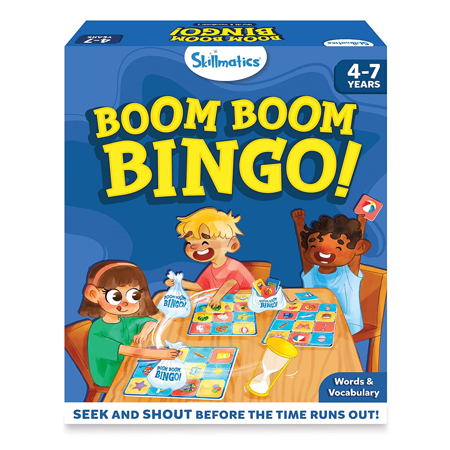Get ready to play an action-packed game of Bingo! Set the timer and search your Bingo Bag for tiles that match your board. Shout Boom Boom Bingo! for each time you match a tile. Be quick and match as many tiles as you can before it's time for the Bingo Bag Swap! The first one to match all the tiles on their Bingo Board wins!