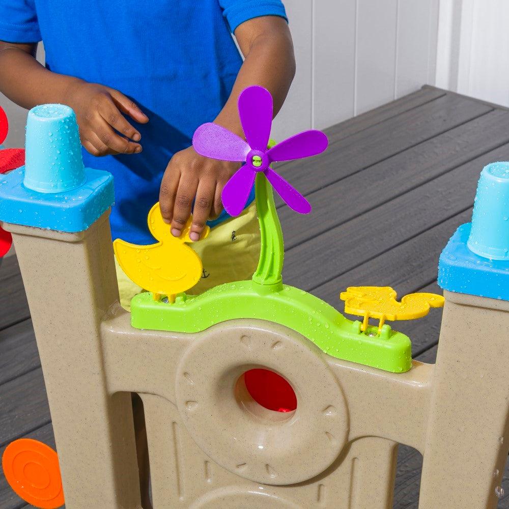 Bring exciting arcade-themed water play fun to your backyard with the Step2 Waterpark Arcade! Tons of kids’ water game targets are lined up and ready for little ones to splash them down with the water blaster, all secured with a large wall and wide base for extra stability. Easily attach the water blaster to a standard garden hose to get the water flowing and begin outside water game time! Little ones will practice their fine motor skills as they squeeze the trigger to use the water blaster to shoot water at each target, knocking them down and activating the spinners to create a big splash. Hit the center bullseye to fill up the spill bucket below – whoever makes the bucket spill into the basin is the winner! The water game for kids’ single-user style is a great way to teach little ones about sharing, patience, and even kindness by cheering friends on as they hit each target. Made in the USA of US and imported parts.